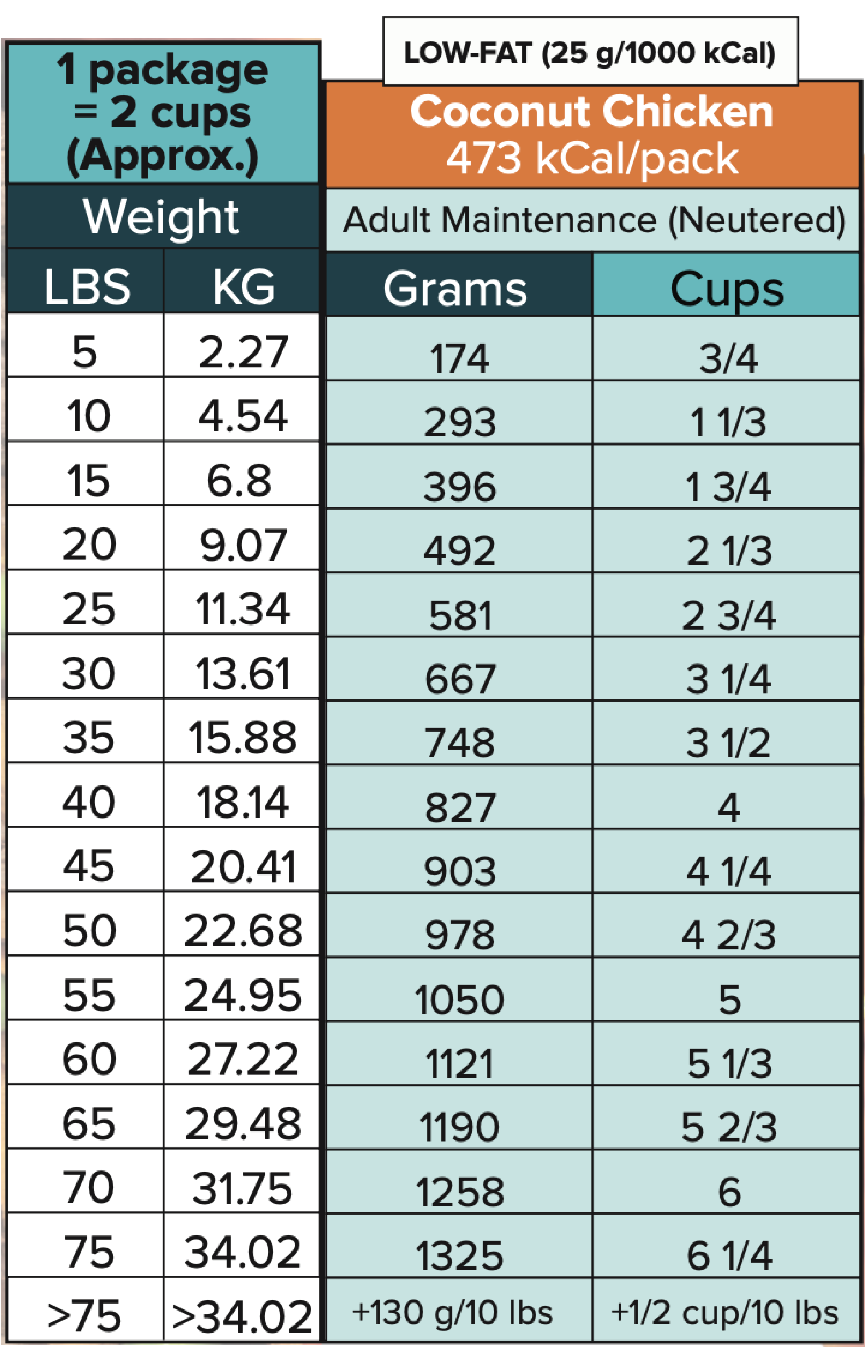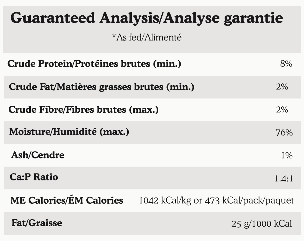 Chicken breast meat, water, white rice, carrots, spinach, coconut milk (water, coconut flesh extract), hemp seed oil, dicalcium phosphate, turmeric, calcium carbonate, omega-3 fish oil (anchovy), amino acid chelated minerals (zinc, iron, copper, manganese), magnesium oxide, potassium iodide, a-tocopherol acetate, sodium selenite, vitamin B12, vitamin A palmitate, niacin, calcium pantothenate, riboflavin, thiamine hydrochloride, vitamin D3, folic acid, pyridoxine hydrochloride, choline bitartrate.Formulated to meet the NRC and AAFCO dog nutrient profiles for maintenance*